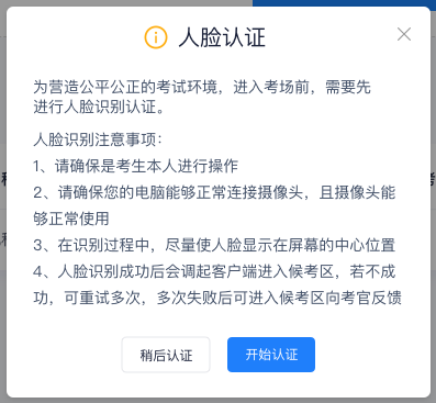 a. 考试开始时,考生需要点击“人脸识别认证”按钮进入,需要允许获取摄像头权限