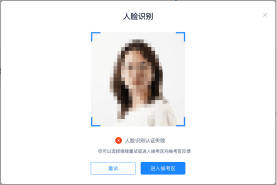 d. 系统对接公安部数据,若认证成功可进入候考区,若认证失败可点击“重试”。若一直认证失败也可进入候考区,但在考官界面会提示“人脸识别认证未通过”,考生须将身份证原件在面试中展示给考官,进行“人证对比”。考试过程中,考官可以查看人脸识别时的截图,确保面试考生是参加人脸识别考生本人,避免替考。