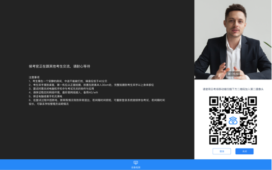 e. 当考试要求使用双摄像头进行面试时,考生需要打开云考场移动端扫描该页面提供的二维码加入第二摄像头考生须将手机屏幕锁定设置成“永不”,避免考试期间因手机锁屏造成第二摄像头无法提供视频画面的情况