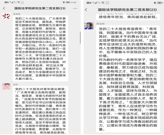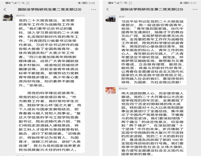 大家纷纷表示,中国共产党第二十次全国代表大会总结过去五年的工作和新时代十年的伟大变革,开辟马克思主义中国化时代化新境界,把党的初心使命、百年奋斗重大成就和历史经验以及发扬斗争精神、增强斗争本领等内容写入党章,对于实现第二个百年奋斗目标具有重要意义。作为新时代青年,要坚定不移听党话、跟党走,准确把握“两个结合”的深刻内涵,始终牢记“三个务必”,坚持自我革命,锤炼过硬本领,提升科研创新能力,切实用党的二十大精神武装头脑、指导实践,为全面依法治国贡献力量。