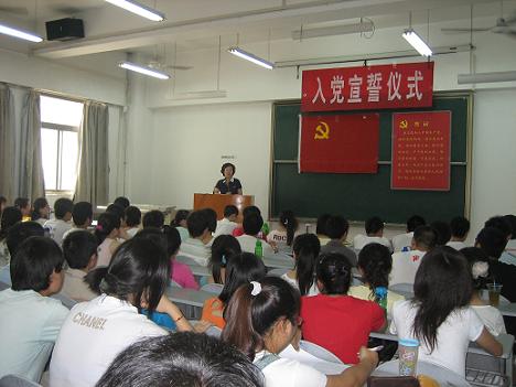 仪式在雄壮的《国际歌》乐曲中正式开始。紧接着,此次入党的全体新党员在刘光勇老师的带领下,面对神圣的党旗,光荣地举起右手进行宣誓,大家声音宏亮有力,场面热烈令人激奋。之后,由06级新党员马帅同学代表此次入党的全体党员同学发言,他从思想、学习、工作、生活等各方面向大家阐明了学生党员应当发挥的积极模范带头作用,并表达了学生党员热爱党、要求进步,并力求在今后的学习生活中不断使自己成长,从而成为一个先进的共产党员的坚定决心。接着,李燕老师对在场的学生党员发表了热情洋溢的讲话,她就现今学生党员所面临的实际问题,向大家作了深入浅出的分析,并结合当代大学生的特点谈了几点自己的希望,她指出:学生党员一定要端正自己的入党动机和态度,做到真正愿意向党组织靠拢,并且在各个方面都要充分地体现党员的先进性作用和模范带头作用,从而不愧于学生党员这样一个光荣的称号。最后,她还结合当下党内腐败问题,对全体新党员同学提出了中肯建议,要求大家正确对待、客观分析,并希望大家抵御诱惑,坚持原则,做一个真正合格的中国共产党员。