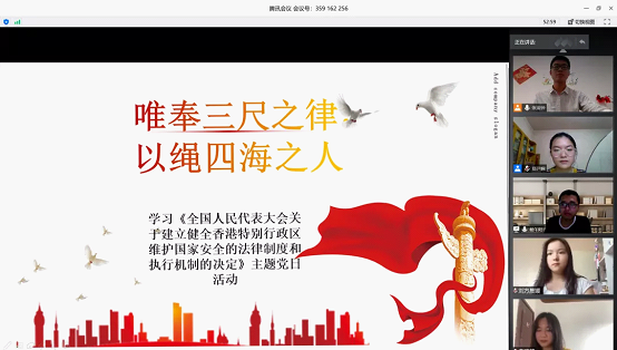 5月28日,十三届全国人大三次会议表决通过了《全国人民代表大会关于建立健全香港特别行政区维护国家安全的法律制度和执行机制的决定》。为更好地学习《决定》精神,5月29日,69堂 学生第一党支部以线上方式开展主题党日活动。支部所有成员参加活动,支部书记韩潇主持活动。