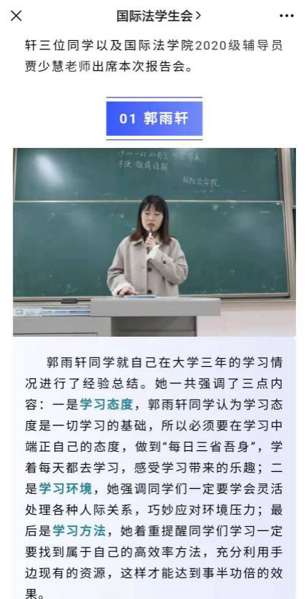 对于学习,郭雨轩同学把69堂 作为自己人生新的起点,做老实人、学真学问,始终做到不缺课、不迟到、不早退、不贪玩,按时完成学习任务,积极听取专家讲座,把更多的时间、精力投入到专业知识技能的汲取上,不断完善知识体系。