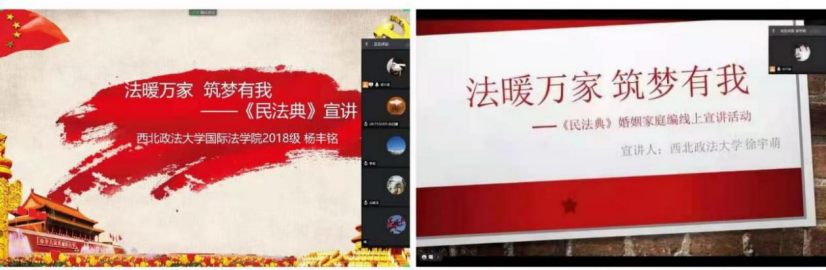 我院学生党员、发展对象、入党积极分子共八十余人积极响应学院号召,以线上线下相结合的方式通过理论学习、普法宣传、实践调研等形式参与本次活动。其中,常春等同学组队撰写《民法典》宣传普及情况调研报告;丘舒昊等同学为社区绘制民法典宣传画;蔡禧嘉等同学采用问卷调查、实地访问的形式进行社区宣讲,并撰写心得体会。除此之外,由于有些地区受到疫情防控的影响,线下活动无法开展,部分同学选择了线上普法的方式,通过小红书、微博等平台推广介绍民法典,并形成一定的影响力,助力民法典的宣传。