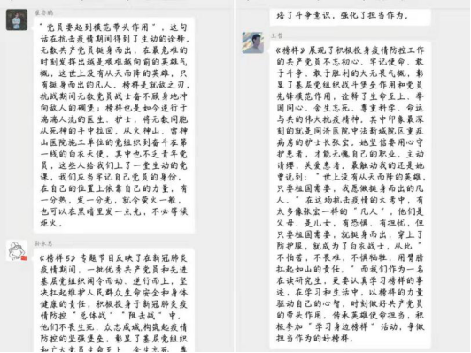 为弘扬抗疫英雄榜样精神,体会共产党人信仰坚定、心系群众、勇于担当、创新奉献的精神风貌,3月29日,69堂 2019级研究生支部以线上会议的形式开展“重温英雄事迹,感受榜样力量”《榜样5》观后感交流会。支部全体成员参加会议,支部书记曹倩倩主持会议。