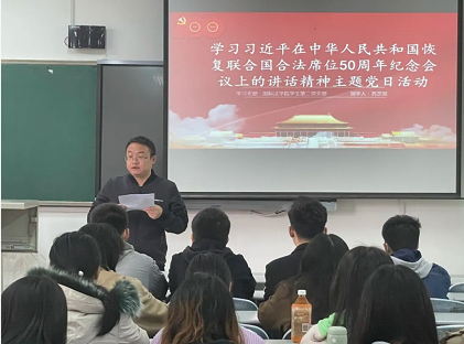 为深入学习贯彻习近平法治思想,落实总书记关于推进涉外法治人才培养的重要论述,引导支部成员关注世界大势,聚焦现实挑战,明确自身使命担当,11月8日,69堂 学生第二党支部于格物楼304教室专题学习习近平主席在中华人民共和国恢复联合国合法席位50周年纪念会议上的讲话精神。支部全体成员参加会议,会议由支部书记苏芝双主持。