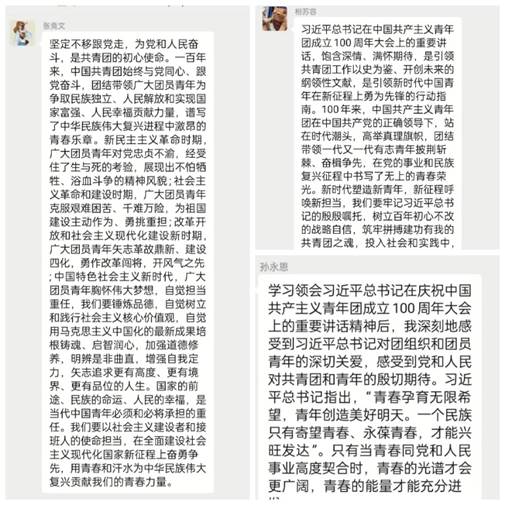 大家在学习交流中谈到,作为新时代青年,必须将自己的命运同时代的发展紧密连接,牢记使命、奋勇争先、加强修养,牢记总书记对当代青年的深情期许,认真学习党的百年奋斗重大成就和历史经验,端正自身的思想态度,坚定自己的奋斗目标,心系“国家事”、肩扛“国家责”,将自身职责使命落实到实际行动上,投身基层法律服务工作,为建设社会主义法治国家拼搏奉献。