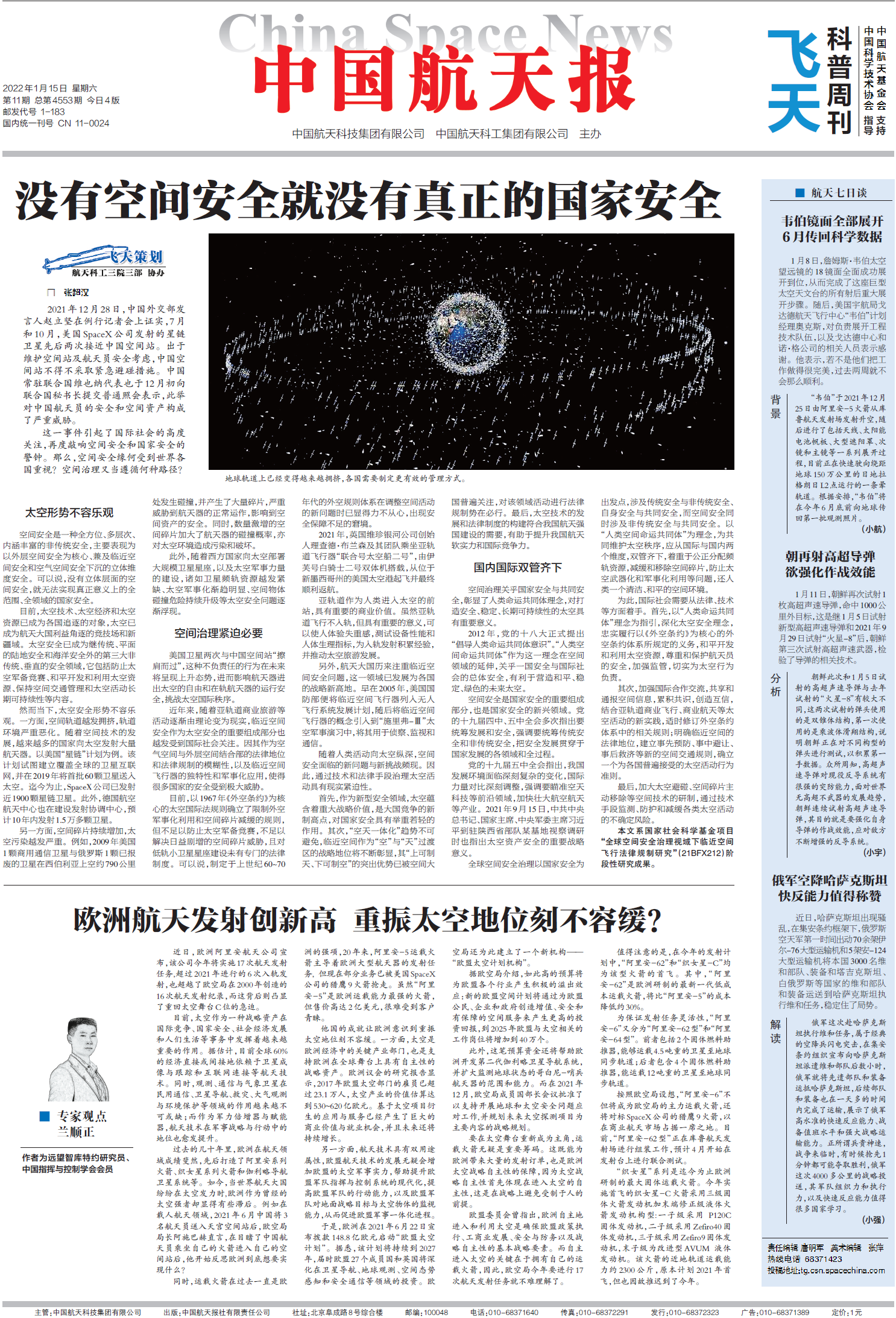 2022年1月15日,我院郑斌航空与空间法研究所副所长、中国国际法学会理事张超汉撰写的评论性文章《没有空间安全,就没有真正的国家安全》在国内航天领域权威性媒体《中国航天报》头版、头条刊发。