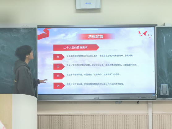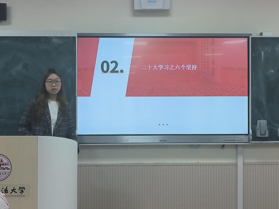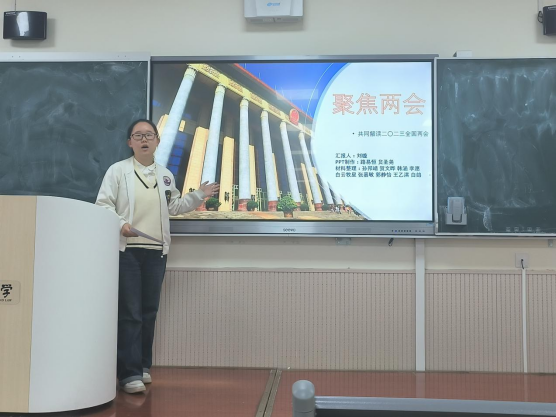 各班团支书和团员分别进行了“学习两会”内容的汇报。张政同学从法治成就进行了汇报,强调了总体国家安全观的重要性。冉镘林,王炫龄等四位同学以数字化的表现形式,为同学们讲解了党的二十大和两会的精神。刘璇同学就政协和人大会议的两个关键议题做了分析讲解,阐明今年是全面贯彻党的二十大精神的开局之年。