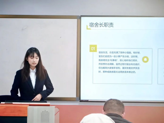 评比现场,各宿舍长依次进行答辩,通过精美的PPT和条理清晰的表达,从宿舍环境建设、成员协作关系到学习生活融合等多个方面分享了宿舍管理经验与创新举措,全方位展现了他们在日常管理中的突出贡献与领导能力。评委们结合发言内容与现场表现进行了打分评议,最终2-401陈瑾榕、2-405孙雨婷、6-212董佳琪三位同学脱颖而出,荣膺优秀宿舍长称号。
