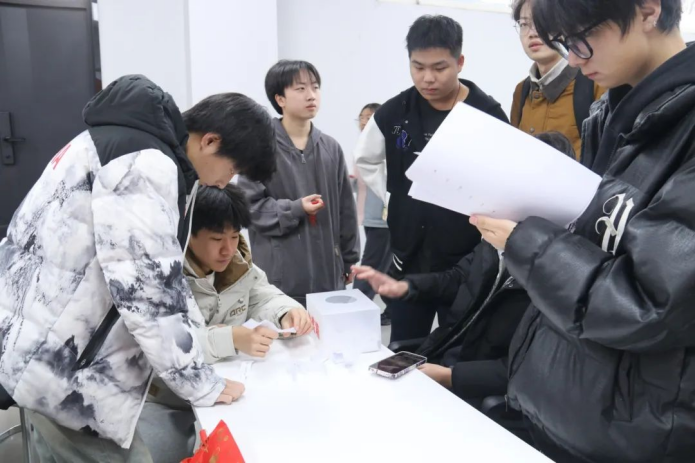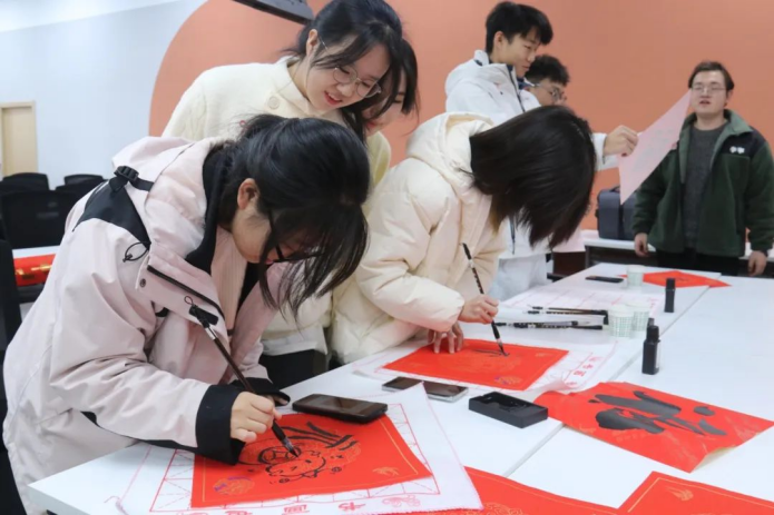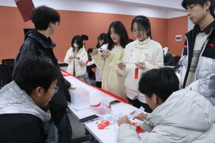 活动现场热闹非凡,节日气氛浓厚。在猜灯谜环节中,同学们或专心思考,或热烈讨论,每当谜底揭晓,欢呼声和笑声顿时响起,为现场增添不少欢乐。在剪纸环节中,同学们手持剪刀,巧手翻飞,剪出精美的窗花和“福”字,既展现了传统技艺的魅力,也寄托了对新年的美好期待。在书写“福”字环节中,徐秉鹏与同学们一起挥毫笔墨,一笔一划都承载着对新年的祝福,现场洋溢着喜庆与温暖。