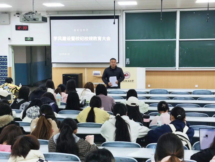 黄思齐通过结合典型案例深度剖析网络行为边界,指出法律学子既是网络空间的参与者,更是法治文明的传播者,必须以“五个过硬”标准要求自己:政治立场过硬、法律素养过硬、网络技能过硬、自律意识过硬、担当精神过硬。在纪律教育环节,黄思齐逐条领学了《学生守则》,强调“纪律是成长的基石,更是法治人才的必修课”,让同学们深深意识到作为法律人,既要善于运用法律武器维护权益,更应更要以身作则,以严格遵守校园规章和课堂纪律为日常准则。