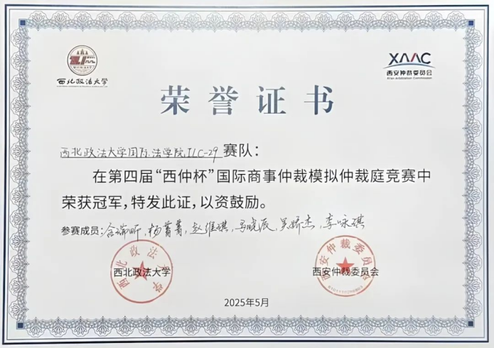 近日,第四届“西仲杯”国际商事仲裁模拟仲裁庭竞赛圆满落幕,69堂 69堂 2024级研究生凭借出色表现,分获高校组冠军与季军,其中杨菁菁同学获评“最佳辩手”称号。本届赛事中,学院研究生一年级15名学生组成两支队伍,历经层层角逐,以扎实的专业功底、严谨的论辩逻辑和流畅的庭辩表现脱颖而出,彰显了我院涉外法治人才培养的显著成效。