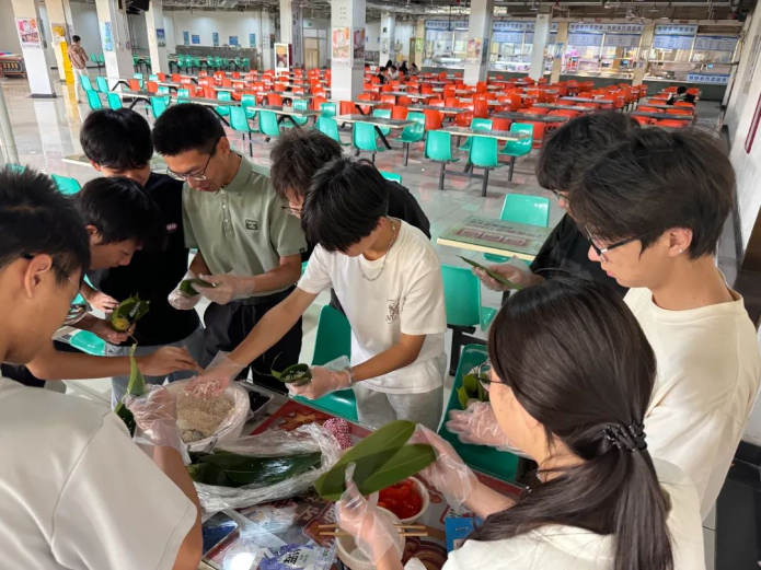 在2024级6班的“粽香盈袖处,情谊满心间”端午主题活动中,同学们围坐成圈,将翠绿粽叶、莹白糯米等食材有序陈列在桌子上,在经验者的示范指导下专注学习包粽技艺。经食堂工作人员精心烹煮,热气腾腾的粽子出锅,同学们品尝着亲手制作的成果,在传统美食的温度中感悟端午文化内涵。