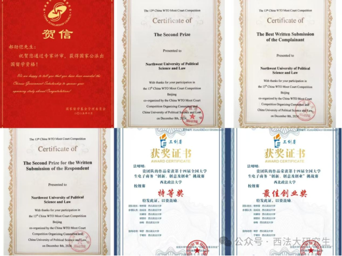 在课外实践中,宿舍成员通过各自努力,在不同领域均取得了斐然的成绩。郝劲凯同学凭借其深厚的英文功底和勤奋的努力,荣获了第十三届“中国WTO模拟法庭”竞赛全国二等奖、申诉方最佳文书奖、被申诉方文书二等奖,以及国家留学基金委全额奖学金,同时,郝同学凭借其复合型的学科背景,还取得了第十届“东方财富杯”全国大学生金融挑战赛省赛二等奖。段成龙同学在深耕学术领域,不仅发表了一篇学术论文,而且参与了一项课题,作为一名出色的国际法学研究生,他还获得全国大学生翻译大赛国家级三等奖。杨泽言同学在学业上不断丰富自己的知识领域和学识眼界,攻读并取得了美国圣路易斯华盛顿大学法学硕士学位,并且代表学校参加外交部国际组织人才遴选。靳汶谚同学精耕法律实践领域,参加了包括“安理杯”法律文书大赛,“西仲杯”国际商事仲裁模拟仲裁庭竞赛在内的多项法律实践比赛。此外,为了将学术理论落到实处,他还在法院、律所进行了数月实习。