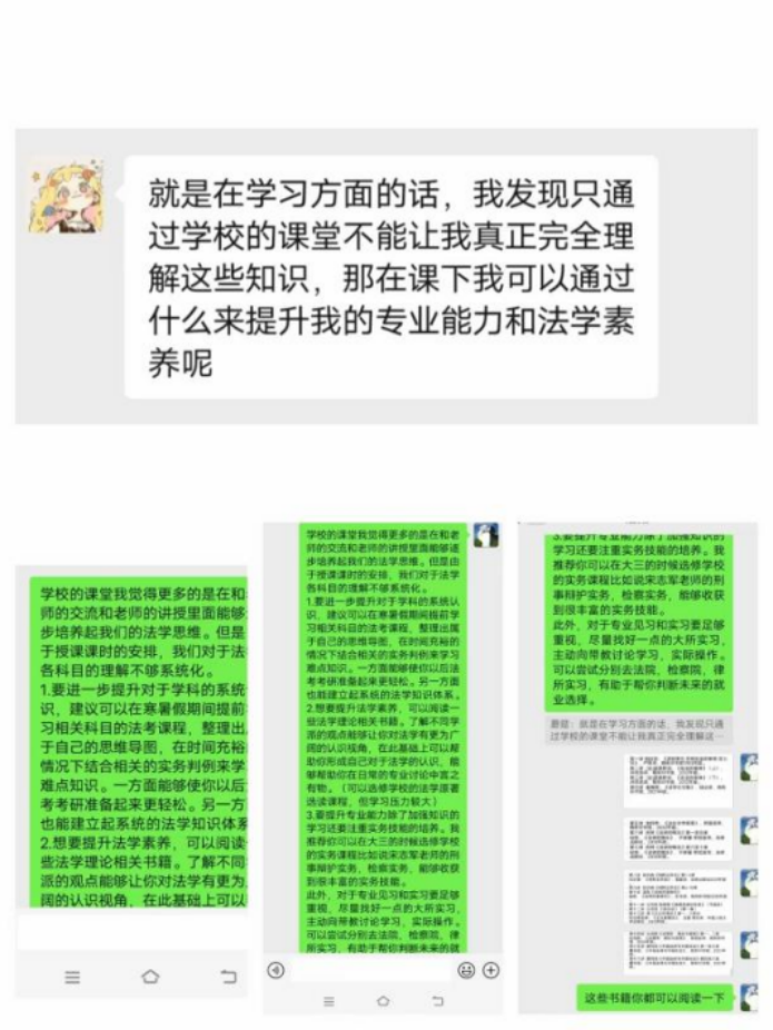 帮扶成效:被帮扶人明确了西安就业方向,掌握了实习信息渠道与不同就业场景的选择逻辑,厘清了考研院校定位与备考策略,提升了法律检索与论文写作能力,建立起对学业、升学与就业的系统规划,使被帮扶人未来的方向更加清晰。
