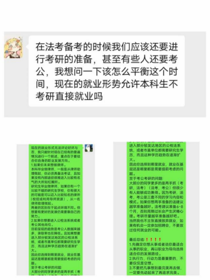 3.与帮扶对象交流未来职业规划路径,针对性提供有关法考,考研,保研,就业分享相关经验。