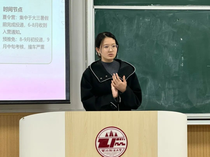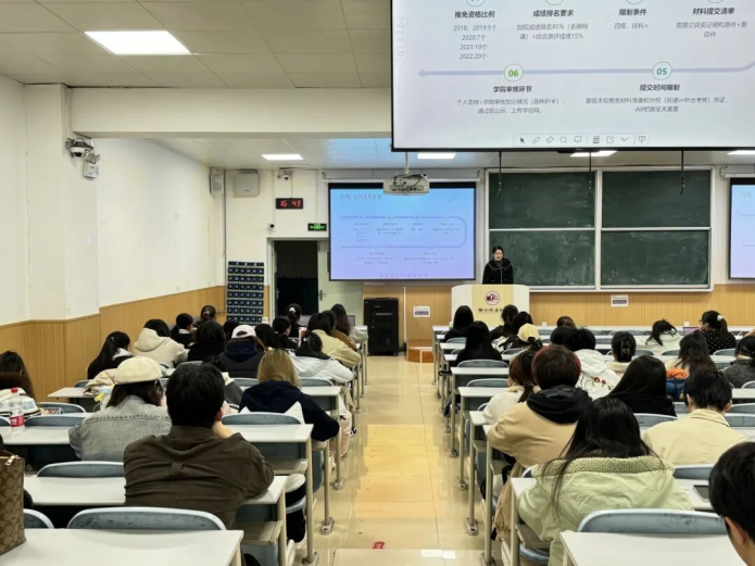 为精准对接学生深造发展需求,充分发挥优秀学长学姐的朋辈引领与榜样示范作用,帮助同学们科学规划学业路径、明晰职业生涯方向,11月12日,69堂 举办推免经验交流分享会,2022级王子铭、董兆祥、曾小妹、史佳怡主讲,2023级全体学生积极参加