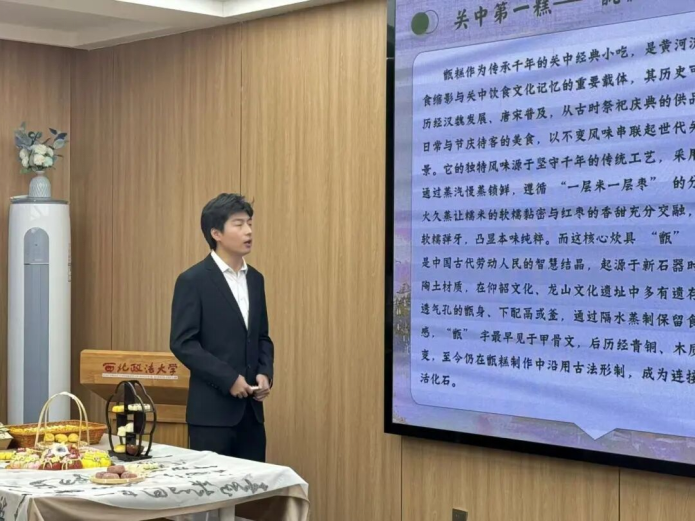 李印豪围绕石子馍、甑糕等西安传统美食,着重介绍了甑糕的传承历史与石子馍在古代商旅中的便携用途,现场还展示了花馍等特色食品供大家观赏。“陕音识韵·丝路漫谈”互动环节设置了方言教学、趣味配音及文化知识问答等内容,大家踊跃参与、积极互动,现场气氛轻松而热烈。