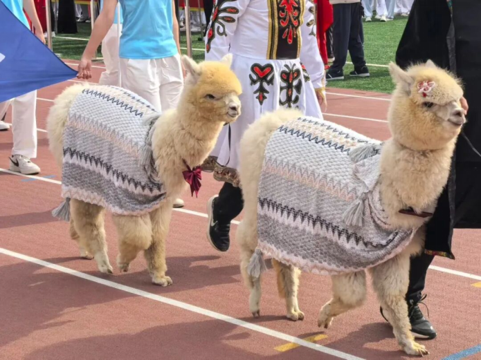 入场式上,我院学生方阵以“一带一路”主题精彩亮相。黄色绸缎铺展如大漠长卷,勾勒出千年文明交流的壮阔图景,共同传递“和平合作、开放包容、互学互鉴、互利共赢”的丝路精神。学生步伐铿锵有力、目光坚毅明亮。方阵前方,学院吉祥物“呆呆”“璐璐”化身“一带一路”友好使者,步履整齐、姿态昂扬,与井然有序的师生队伍相映生辉,展现青春朝气。