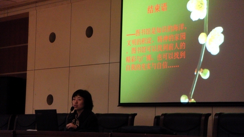 南,北校区两座图书馆分布的相关信息。紧接着,利用多媒体向新生介绍了图书馆的定义及类型,并且通过详尽的讲解和大量的网站图片展示,生动介绍了图书类型的具体检索和借阅的程序及相关注意事项。然后向新生介绍了图书馆的读者服务类型,最后,以话语激励我们充分利用图书馆丰富资源努力学习。