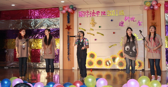 晚七点半一场激情四射的开场舞拉开了这次晚会的序幕,由2011级新生带来的幽默风趣的相声《我的大一生活》,讲述了11级新生对学校的新感受,歌曲串烧带我们走近纯真的世界,感受爱情的美好,话剧《武林新传》以搞怪的反串逗得观众捧腹大笑,一群青春靓丽的女孩为我们带来了美仑美奂的舞蹈,彰显了青春的活力,魔术《恋爱33天》给我们展示了爱与神奇,晚会期间主持人向我们介绍了我院08级秦开田同学患病情况,并以一首温暖人心的歌曲《爱》在我们心中播下爱的种子,也向秦开田同学表示了最真挚的祝愿,由大二的学生带来的民族舞蹈《太阳鼓》让我们感受少数民族的异彩纷呈的民族文化,由大二学生带来的相声《我曾今的大一生活》向我们展示了他们曾经的大一生活,《双节棍》表演把大会推向了高潮,一曲悠扬婉转的《青花瓷》又让我们心神荡漾,2009级的学长为我们深情演唱《海芋恋》和《私奔到月球》,慷慨激昂的《恰同学少年》也让我们热些沸腾。最后,晚会在由69堂