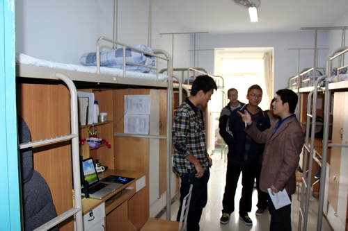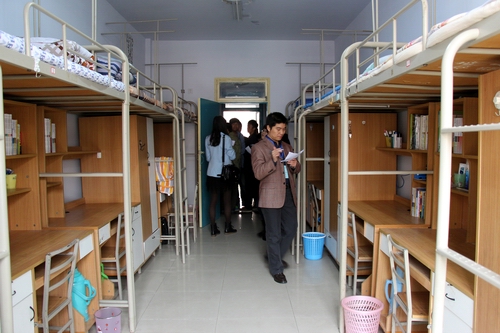 学生会成员按照事先的安排分成三支队伍,其中两位到场的老师各自带领一支队伍分头对宿舍进行检查。检查对象是大一到大三的学生宿舍,主要集中在4号楼、9号楼、10号楼、13号楼、12号楼、14号楼。检查的重点是学生宿舍床铺是否整齐,地面墙面的干净程度,有无违禁电器,整体感觉是否良好等。