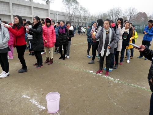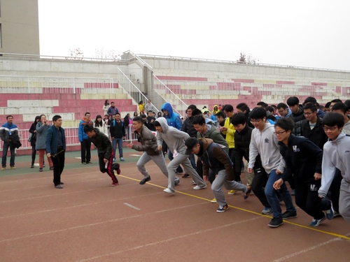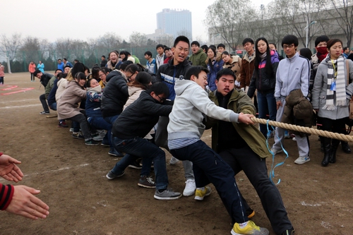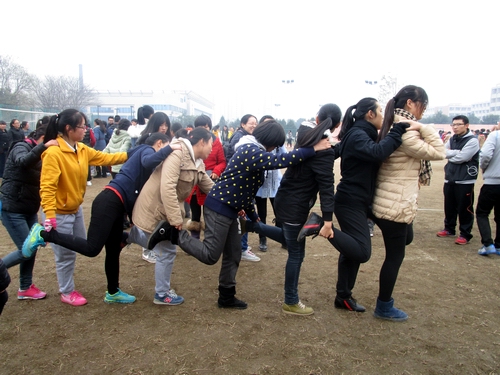 下午2点,进行拔河和趣味组合接力两个项目。首先进行的是拔河比赛,共有十支队伍参赛,两两对决。比赛实行三局两胜制,对前四名班级进行奖励。大家发挥团队意识,共拉一根绳,心往一处靠,力往一处使。选手们拼劲全力,场下的拉拉队也为自己的班级呐喊助威,比赛气氛十分热烈。经过激烈角逐,2014级一班夺冠,2013级二班和2014级五班分别获得第二名和第三名。随后进行趣味组合接力,由扔乒乓球、猛龙过江、障碍背人、风火轮四个项目组合而成,接力赛中大家相互配合默契,团结一心。尽管天气寒冷,但同学们乐在其中。最后,2013级一班、2014级四班、2014级二班分别获得前三名。