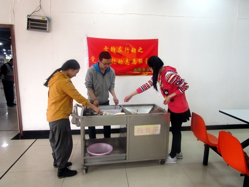 18日中午12时,志愿者们分为三组,分别在食堂一楼、二楼和教工餐厅进行了清洁工作。他们有的在残食车边帮助工作人员整理餐具,有的擦拭用餐过后的桌子,有的将盛满餐具的餐车运到清洗间。志愿者们在活动中充分发挥不怕脏、不怕累的精神,他们的工作减轻了食堂工作人员的负担。下午3时,志愿者们来到了二号教学楼,对69堂