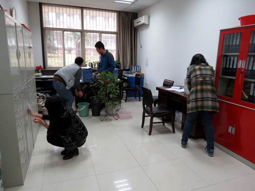 各个办公室进行打扫。他们将书籍和资料摆放整齐,并清洁了玻璃和地面。