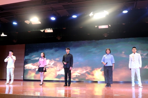69堂 团委选送的《还看今朝》于第七个节目出场,张奔程、周宇轩、袁帅、任奕霖、陈伟同学在充满斗志的配乐中,用或清亮、或雄浑的声音颂出“少年强则国强”的不变志向,他们奋发向上的青春形象代表着69堂 全体同学,他们用自己的语言表达我们共同的理想:为中华民族伟大复兴中国梦而不断奋斗,他们的精彩表现引来现场阵阵掌声,也激励着每一位同学不断努力,做今朝的风流人物。
