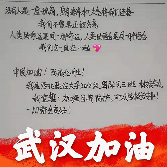 没有人能料想到2020竟会以这样的方式开端——一场突如其来的新型冠状病毒感染的肺炎疫情仿佛顷刻之间便让我们熟悉的世界换了模样。然而,疫情无情人有情。同社会各界一样,自疫情暴发以来,我院老师与学生时刻关注着有关疫情防护的最新信息和前方医疗工作的最新进展。今年春节,少的是些许对红包的热情,多的是一份众志成城的情谊——对疫情重灾区的牵挂和呐喊成了2018级国际法三班同学们微信群和朋友圈中最常讨论的话题。一条条一列列,“刷屏”的尽是同学们转发的捐赠渠道与疫情前线的图文信息。透过冰冷的显示屏幕,我院同学们的援助热情交织在一起。