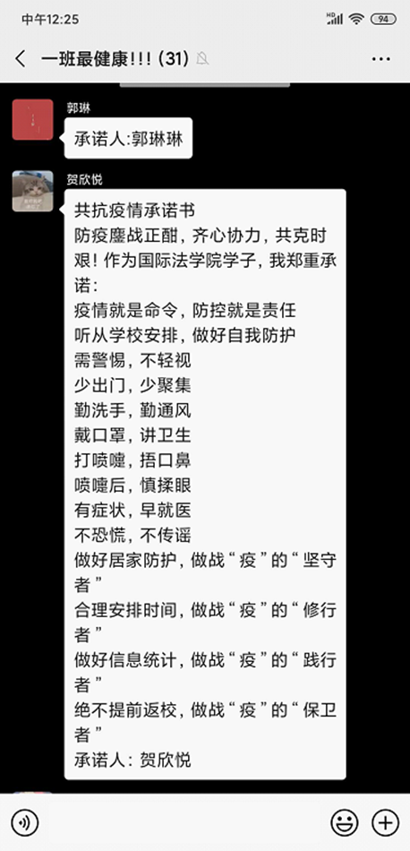 在给大家传阅了69堂 递发给大家的倡议书后,2017级1班团委又接连分享给大家一些先行有效的防疫手段以提高大家居家时的防疫效率。随即,班团委们编辑了承诺函一份,在大家穿越后号召大家签字以表明作为团组织成员配合69堂 院团委工作的决心,承诺函全文如下: