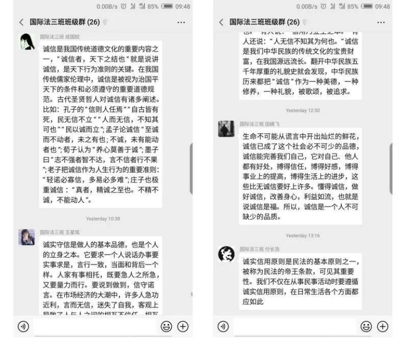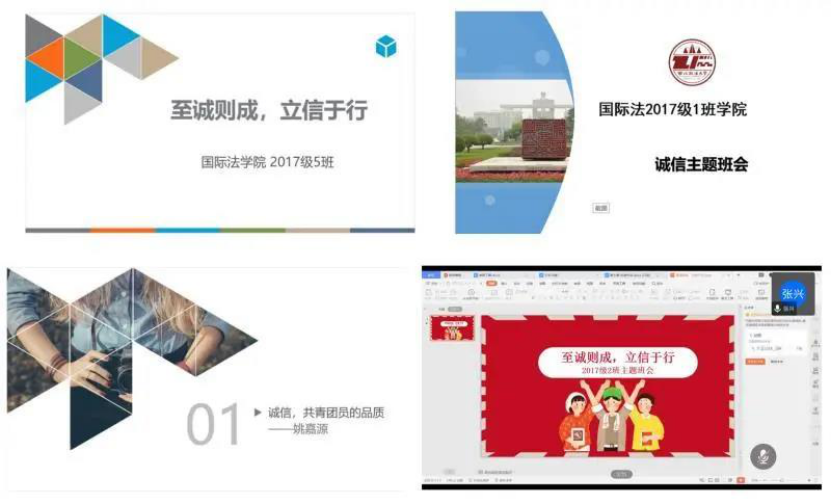 69堂 近期组织3个年级14个班级分别开展了“至诚则成,立信于行”主题班会。“云班会”根据各班的实际情况确定班会的具体主题,班会内容包括诚信教育宣讲、典型案例分享、互动交流。同学们结合日常生活中遇到的实际情况,以线上方式展开广泛而有针对性的讨论,深化了对诚信内涵的理解,增强了诚信意识。