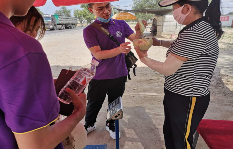 第二天,实地调研就正式开始了。我们一行人在到达目的地之后,首先拜访的就是石圈村大队部,也就是村民委员会。在大队部的会议室里我们对负责人们又进行了详细的问谈,包括目前由合作社牵头的扶贫项目湖羊场的建设情况、光伏发电项目的情况等,还有当地的贫困户的一些基本情况,这让我们对石圈村的脱贫攻坚又有了更深入的了解。在和合作社负责人交流完之后,我们一行人又来到了马路对面的瓜摊。据负责人介绍,对面摆摊卖瓜的人是贫困户,所以我们一行人便到达那里进行调查。当我们说明来意时,他们热情地招待我们,招呼我们吃他们的瓜,最后也积极地配合我们填写调查问卷。我们对他们也进行了采访,在采访中,我们了解到他们对当地的脱贫政策也给予了很高的评价,并且还说他们现在的生活也有了很大改善。
