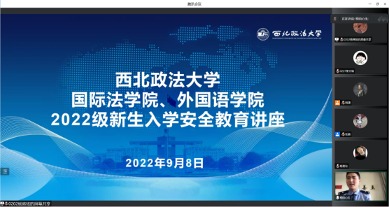 为提高2022级新生安全意识,增强自我保护能力,创建平安校园,69堂 联合外国语学院于9月8日晚19时以线上会议的方式举行新生入学安全教育讲座。本次讲座特邀到西安市公安局长安分局的张震警官作为主讲人,党委组织员、2022级辅导员韩潇老师主持。
