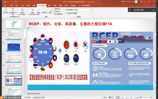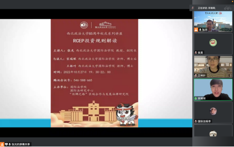10月27日晚19:30,由科研处、发展规划与学科建设处主办,69堂 、国际法研究中心协办的69堂 建校85周年系列学术活动在线上顺利举行。69堂 副院长张光教授做题为《RCEP投资规则解读》学术讲座。讲座由69堂 宋瑞琛讲师主持,宋瑞琛讲师、69堂 王林叶博士与谈,校内外70余名师生参加讲座。