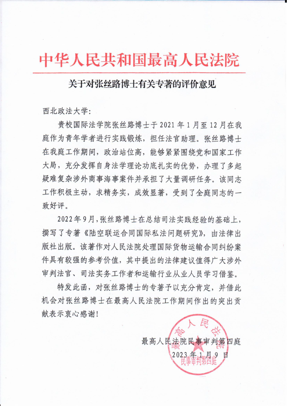 近日,我院国际私法教研室张丝路博士的专著《陆空联运合同国际私法问题研究》获最高人民法院民事审判第四庭肯定性评价。最高人民法院民事审判第四庭在来函中对张丝路博士在挂职锻炼期间的工作表示感谢,充分肯定张丝路博士的专著对于处理国际货物运输合同纠纷案件的参考意义,并对张丝路博士的专著作出肯定性评价。