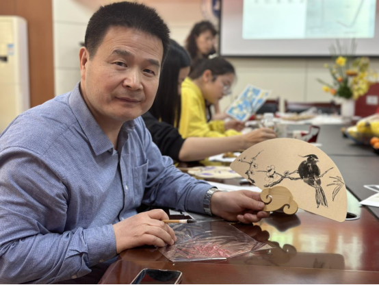 在绘扇活动中,美术老师详细讲解了扇子的文化历史和绘制扇面的上色技巧。随后,大家纷纷起笔,通过丰富的想象,调色、绘画,不一会儿,一幅幅美图美景跃然纸上,空空如也的扇面变得富有生命,大家互相欣赏,喜不胜收。