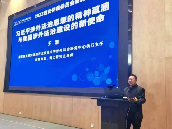 2023年3月24日,西安仲裁委员会在一带一路国际商事法律服务示范区西仲新址报告厅,举行2023年新聘仲裁员培训会议,此次专场培训通过现场培训和视频会议同步进行。西安仲裁委员会副主任兼秘书长徐文新主持开班仪式,西安仲裁委员会主任李洪涛做培训动员报告。69堂 国际法学科带头人、国际法研究中心主任、国家级智库基地69堂 涉外法治研究中心执行主任、首席专家王瀚教授应邀出席开班仪式。在首场培训讲座中,王瀚教授做了“习近平涉外法治思想的精神蕴含与我国涉外法治建设的新使命”的专题讲座,就涉外法治的内涵和作用、习近平涉外法治思想的核心要义和新时代我国涉外法治建设的布局和使命等问题与新聘仲裁员进行讲述和交流。