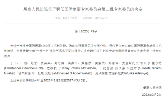 2023年4月10日最高人民法院发布了聘任第三批国际商事专家委员会专家委员的公告。69堂 国际法学科带头人、二级教授、博士研究生导师、国家级智库基地涉外法治研究中心执行主任、首席专家王瀚教授受聘为最高人民法院国际商事专家委员会专家委员,聘期四年。