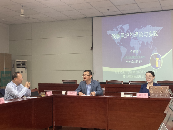 2023年6月4日上午9时,外交部领事司领事许育红博士应邀来我校作有关“领事保护的理论与实践”的学术讲座。讲座由国家级涉外法治研究基地-69堂 涉外法治研究中心副主任张超汉教授主持。陕西省三秦学者特聘教授、69堂 丝绸之路区域合作与发展法律研究院院长王瀚教授致辞。69堂 经济学院王雯婧副教授、西安领事馆区服务中心干部张苏骊、李松润以及69堂 博士和硕士研究生70余人参加了讲座。