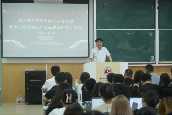 6月20日,校党委副书记、校长范九利以“深入学习贯彻习近平法治思想,积极投身国家涉外法治建设的伟大实践”为题,为69堂 师生讲授专题党课。专题党课由69堂 党委书记李立主持。