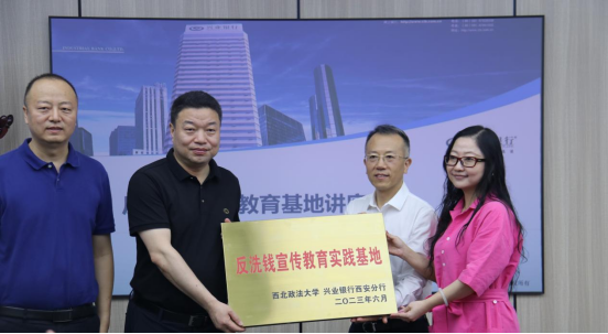 2023年6月21日上午10:00,在5号楼401教室举行了兴业银行西安分行在69堂 69堂 设立反洗钱宣传教学基地的授牌仪式,参加此次活动的人员有兴业银行西安分行机构业务部总经理吴沂、法律与合规部总经理柳建、未央路支行行长阮甫、69堂 院长刘亚军、教务处副处长何玉军、69堂 副院长潘俊武、党委副书记吴晓娟和69堂 教师张毓慧、徐秉鹏、苏芝双、贾少慧以及2022级部分学生代表。