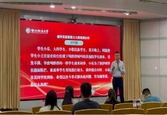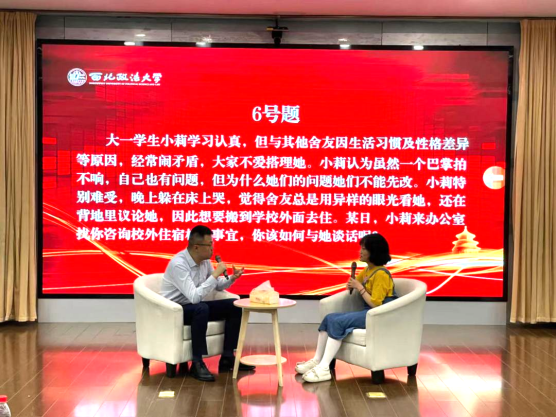 比赛过程中,韩潇紧扣学生思想政治教育和日常管理中的实际问题,准确把握问题关键点,聚焦工作实务,提出解决对策,展示出扎实的政治理论素养和过硬的专业能力,充分展现了我院辅导员的业务水平和精神风貌。