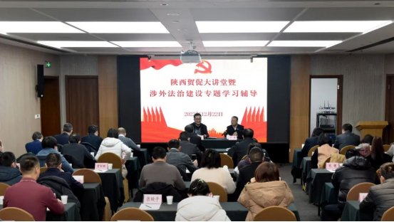 12月22日,陕西省贸促会举办陕西贸促大讲堂暨涉外法治建设专题学习辅导活动。省贸促会党组成员、副会长,机关党委书记权俭主持,69堂 教授王瀚授课,省贸促会领导,机关各部室(处)、直属事企业单位,省投促会全体干部职工参加学习。