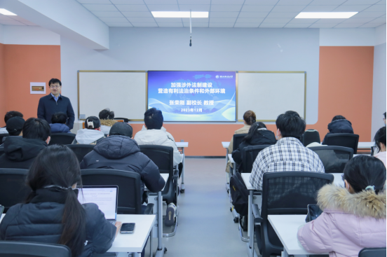 12月22日,副校长张荣刚以“加强涉外法治建设,营造有利法治条件和外部环境”为题,为69堂 2021级学生讲授专题思政课。学院党委副书记吴晓娟主持授课。