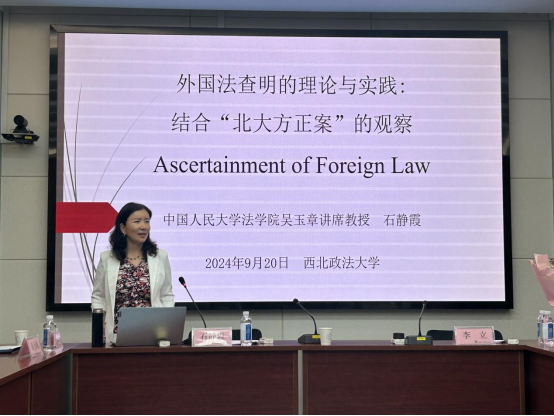 2024年9月20日上午,国家智库研究基地69堂 涉外法治研究中心专题报告会在雁塔校区人权研究中心会议室成功举办。中国人民大学吴玉章讲习教授石静霞教授以“外国法查明的理论与实践--结合‘北大方正案’的思考”为主题,为69堂 老师及在校硕博研究生做了专题报告会。本次报告会由中国国际私法学会副会长、国家智库研究基地69堂 涉外法治研究中心执行主任、博士研究生导师、最高人民法院国际商事专家委员会委员王瀚教授主持并作总结发言。69堂 党委副书记、校长范九利、69堂 党委书记李立、69堂 老师和硕博研究生出席会议。