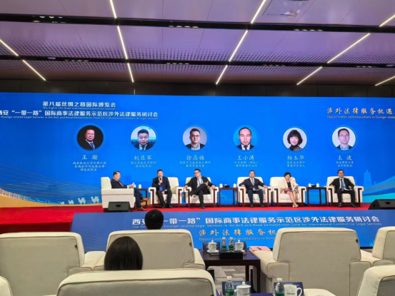 金秋九月万物丰盈,千年古城躬逢盛会。2024年9月21日,第八届丝绸之路国际博览会西安“一带一路”国际商事法律服务示范区涉外法律服务研讨会在西安国际会展中心举行。“一带一路”律师联盟秘书长康煜、陕西省司法厅副厅长师建平、西安市人民政府办公厅副主任王志林、中华全国律师协会副会长韩永安、西安市法学会专职副会长王铁出席活动。中共西安市委全面依法治市委员会办公室副主任、西安市司法局党组书记赵夏主持开幕式。市级有关部门负责同志,各区县、开发区及司法行政部门有关负责同志,驻西安高校有关负责同志,市、区县法学会理事,以及来自企业和律师、公证、司法鉴定、调解、仲裁等行业代表共计140余人参加了研讨会。