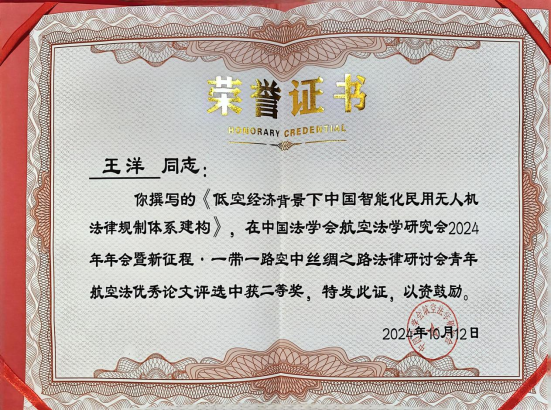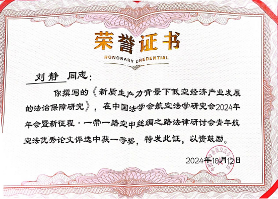在本次研讨会主题征文中,经主办单位组织专家认真评选,并经中国法学会航空法学研究会会长办公会审议,从80篇参评论文中择优评选出15篇论文获得会议“青年航空法优秀论文”。我院新入职的青年教师刘静博士撰写的《新质生产力背景下低空经济产业发展的法治保障研究》荣获一等奖,并且刘静博士在研讨会的“青年航空法论坛”中作主题发言。由张超汉教授指导的学生王洋撰写的《低空经济背景下中国智能化民用无人机法律规制体系建构》荣获二等奖。